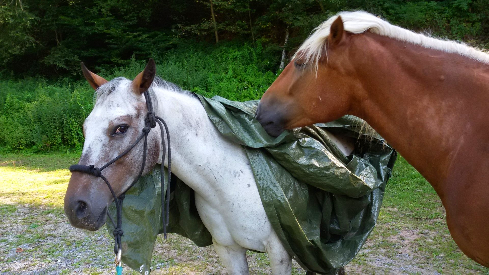 Das Training mit raschelnden Planen gehört zum Ausbildungsprogramm. Für manche Pferde ist es beängstigend, wenn etwas auf ihrem Rücken liegt, das sie nicht kennen. Und wenn es dann auch noch raschelt.... Moritz lässt sich nicht beeindrucken.